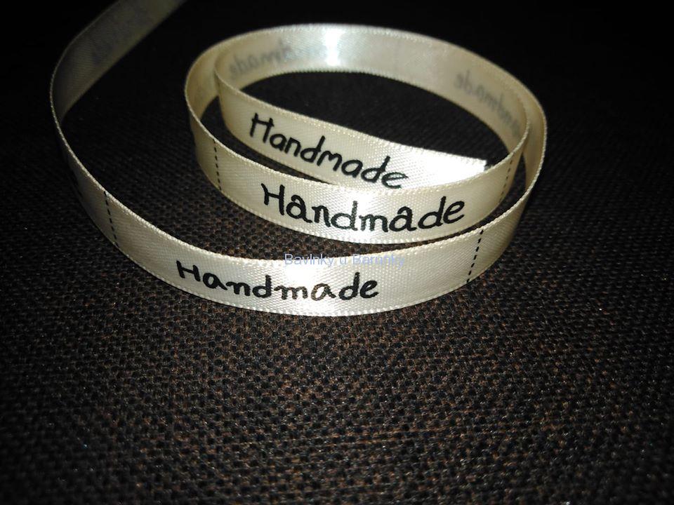 Saténová stuha s nápisem Handmade. Šířka cca 1cm, uvedená cena za 1 metr. V metru je 20 úseků s nápisem.