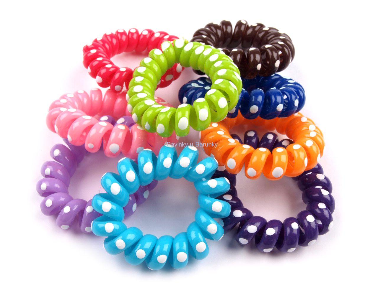 Spirálová gumička s puntíky ozvláštní každý obyčejný cop. Pokud máte rády nevšední a originální věci, tato plastová pružinka bude pro vaše vlasy ideální. Lehce se natahuje a v copu pevně drží. Vytahání gumičky nehrozí, vrací se do původního tvaru.