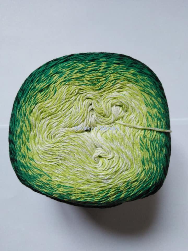 Jemná, nadýchaná čtyřnitka kombinovaná s krásnými dlouhými přechody mezi barvami. Složená z kvalitní recyklované bavlny, vhodná pro jarní šály, šátky, oblečení pro děti i dospělé, čepičky, ponča, tuniky i hračky.