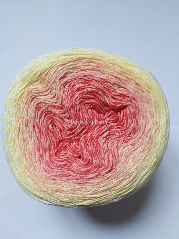 Jemná, nadýchaná čtyřnitka kombinovaná s krásnými dlouhými přechody mezi barvami. Složená z kvalitní recyklované bavlny, vhodná pro jarní šály, šátky, oblečení pro děti i dospělé, čepičky, ponča, tuniky i hračky.
